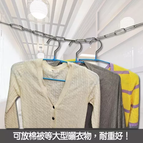 您還在煩惱大型的被單怎們曬嗎??有衣架可以承受被單的重量嗎?您的救星《皇家拿鐵》不鏽鋼曬衣鍊臺灣製造,方便收納,堅固耐用,不易損傷,拉力強,長度可任意調整,長度不夠時可多條連接使用,可吊掛衣物、庭園裝飾、圍圈多用途使用!解決您多總的困惱!